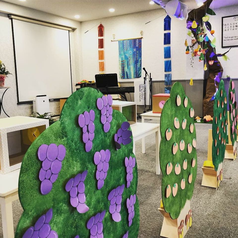 教室 の中に実がたわわに実った大きな木が出現!沢山の秋の収穫物に囲