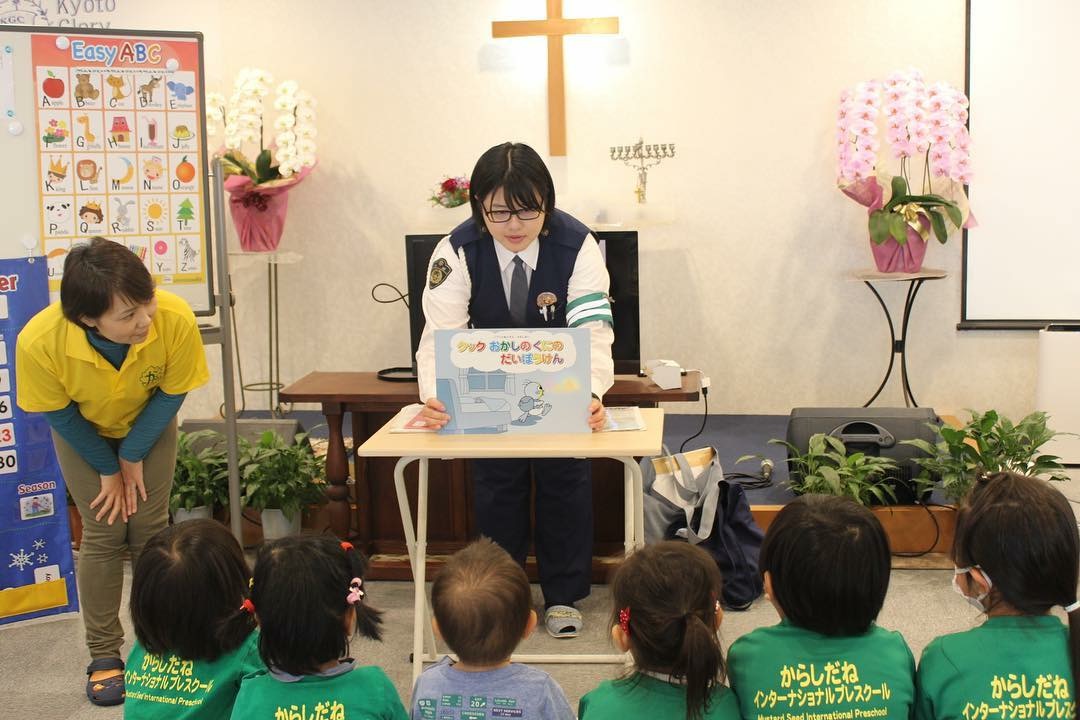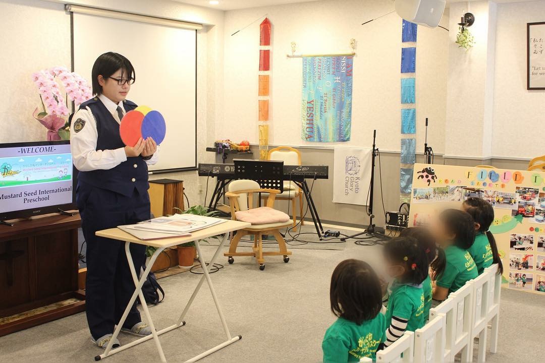 警察署から交通安全指導員をお迎えして、道路を歩く時、自転車に